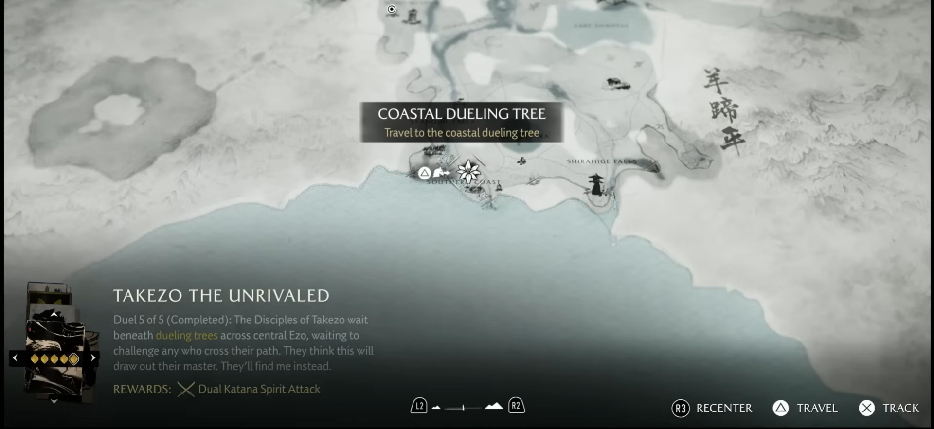 To begin the mythic tale, visit Ugetsu the storyteller near the Coastal Dueling Tree in the Yotei Grasslands. After hearing the tale, five Dueling Tree challenges become available across Ezo, where you'll battle skilled ronin. Each duel also rewards a unique charm, essential for the final phase.