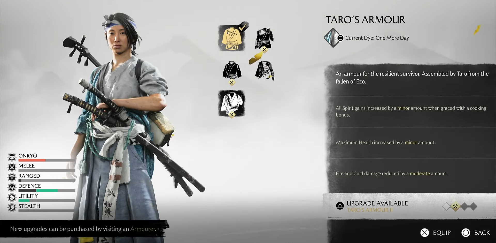 Speaking to him completes part of the story, and upon completion, he rewards you with Taro’s Armor, a lightweight set designed for stealth and mobility.