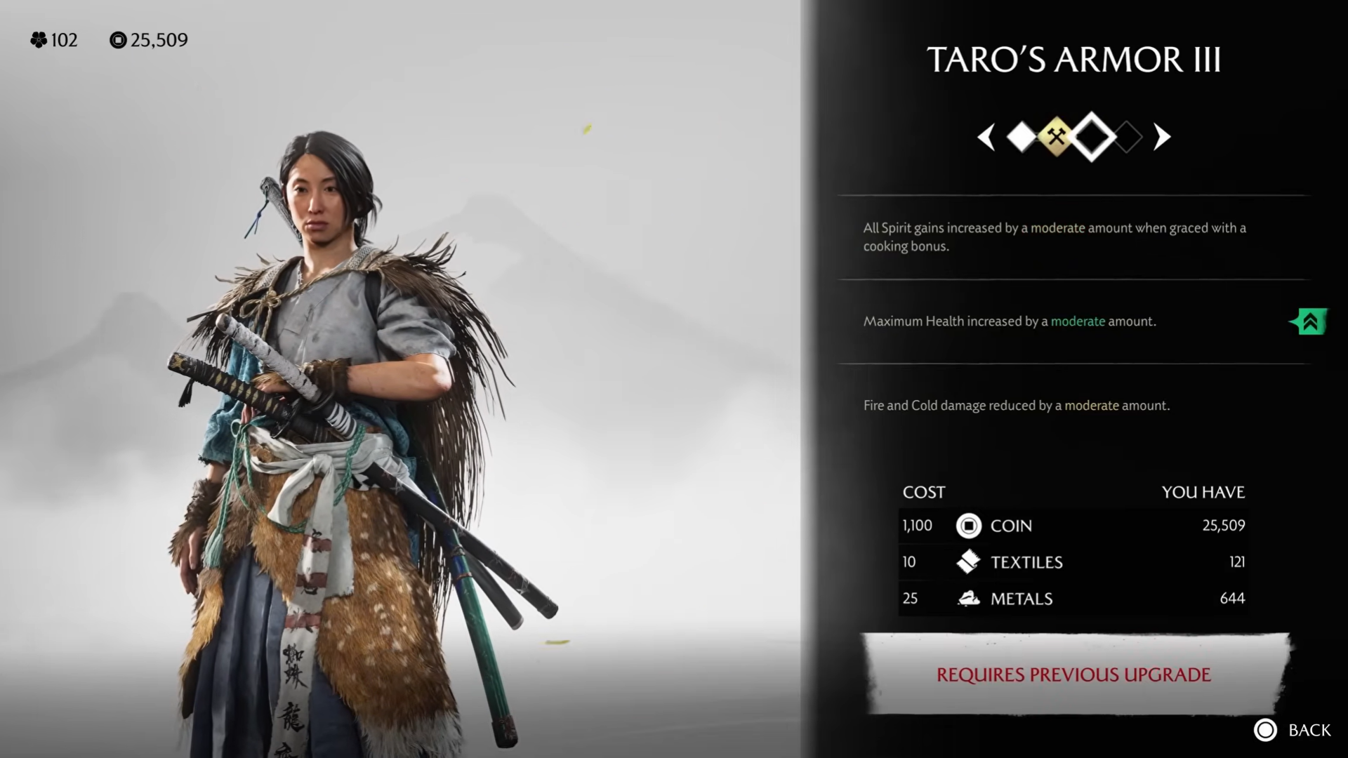 | Upgrade 4 | Major fire and cold damage reduction | Coin ×2000, Textile ×20, Rare Metal ×10 |