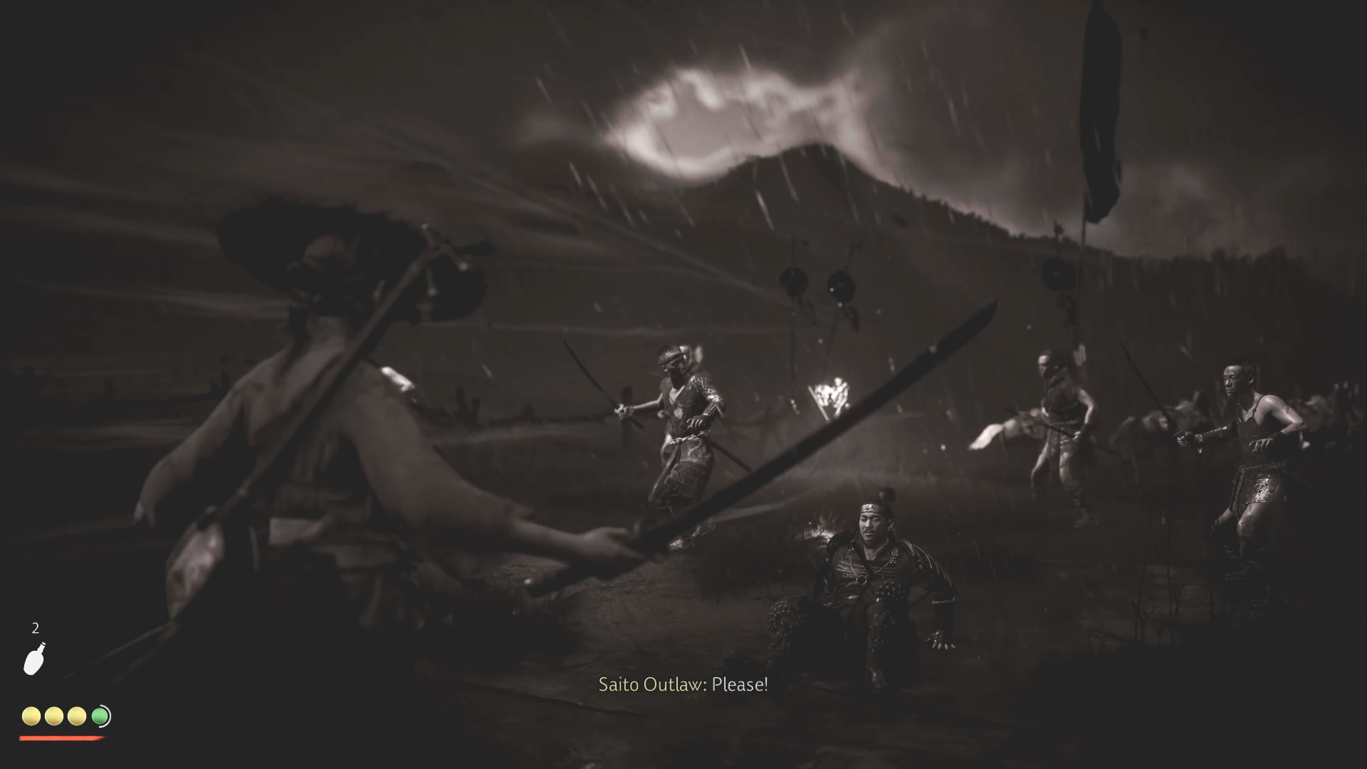 After the Standoff, multiple waves of Saito’s outlaws will assault you. Use your standard moves (light, heavy attacks, dodge, block) to survive.