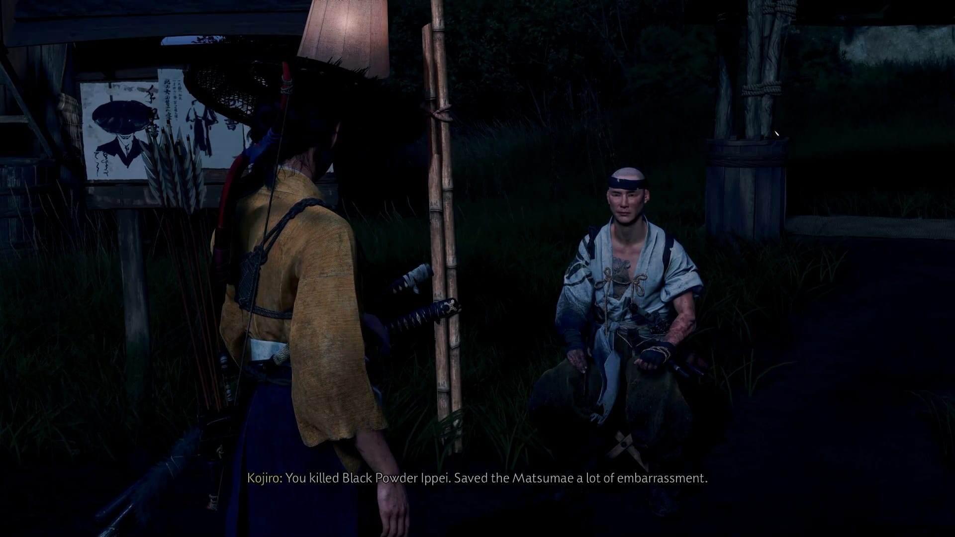 | Kojiro the Bounty Broker | Outside the inn, to the left, near the Bounty Board | Gives you bounty posters; you can take on side hunts and return to him to claim rewards. |