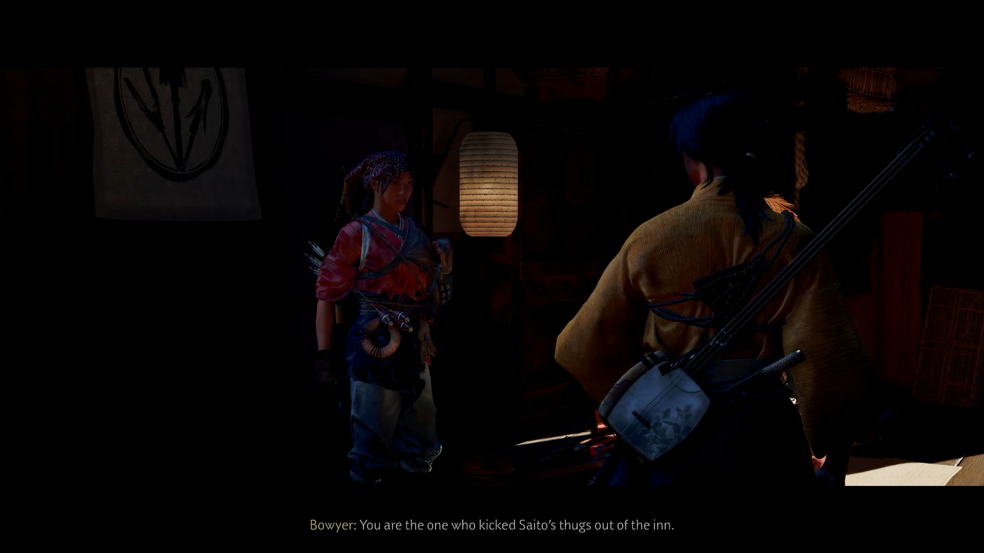 Once you eliminate the last outlaw, a cutscene triggers. Then you head inside the inn (first floor) where a Settler NPC will speak with you. During the dialogue, you choose a clue (either about Kitsune or Oni) which becomes part of your lead on the Yōtei Six.