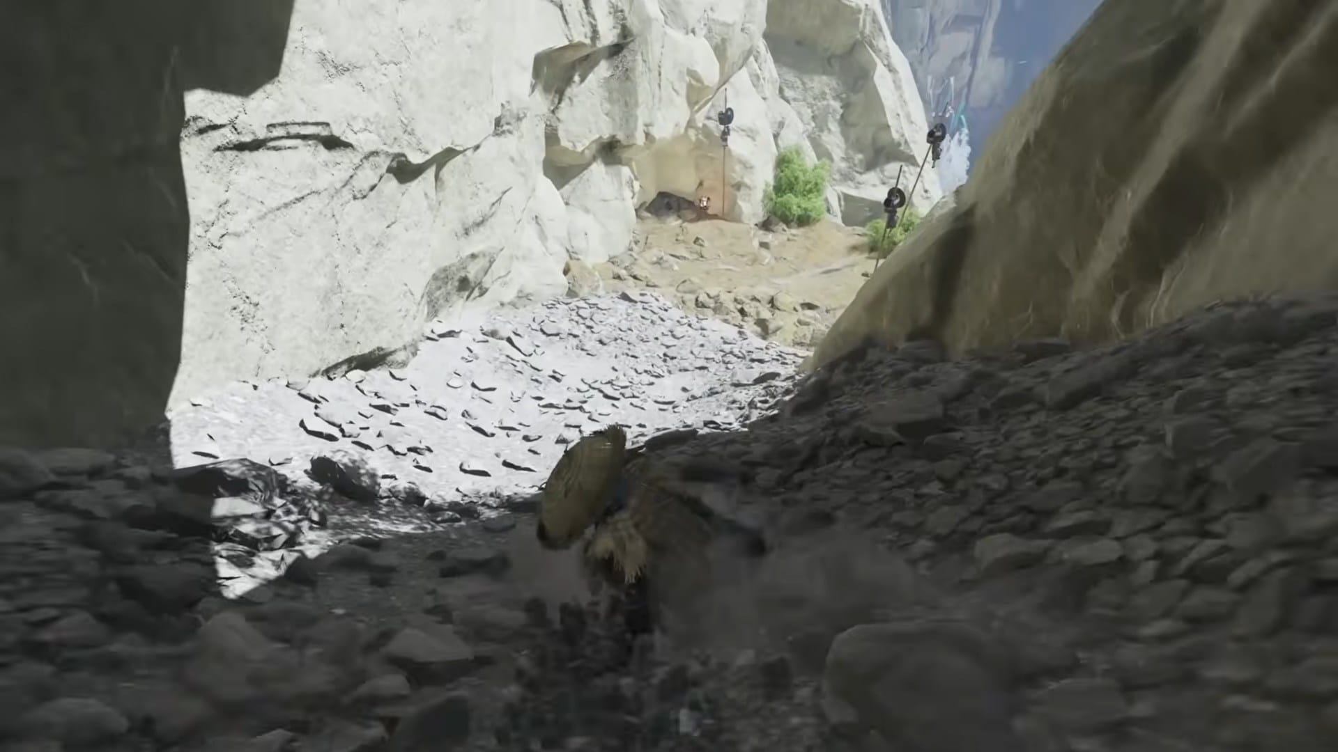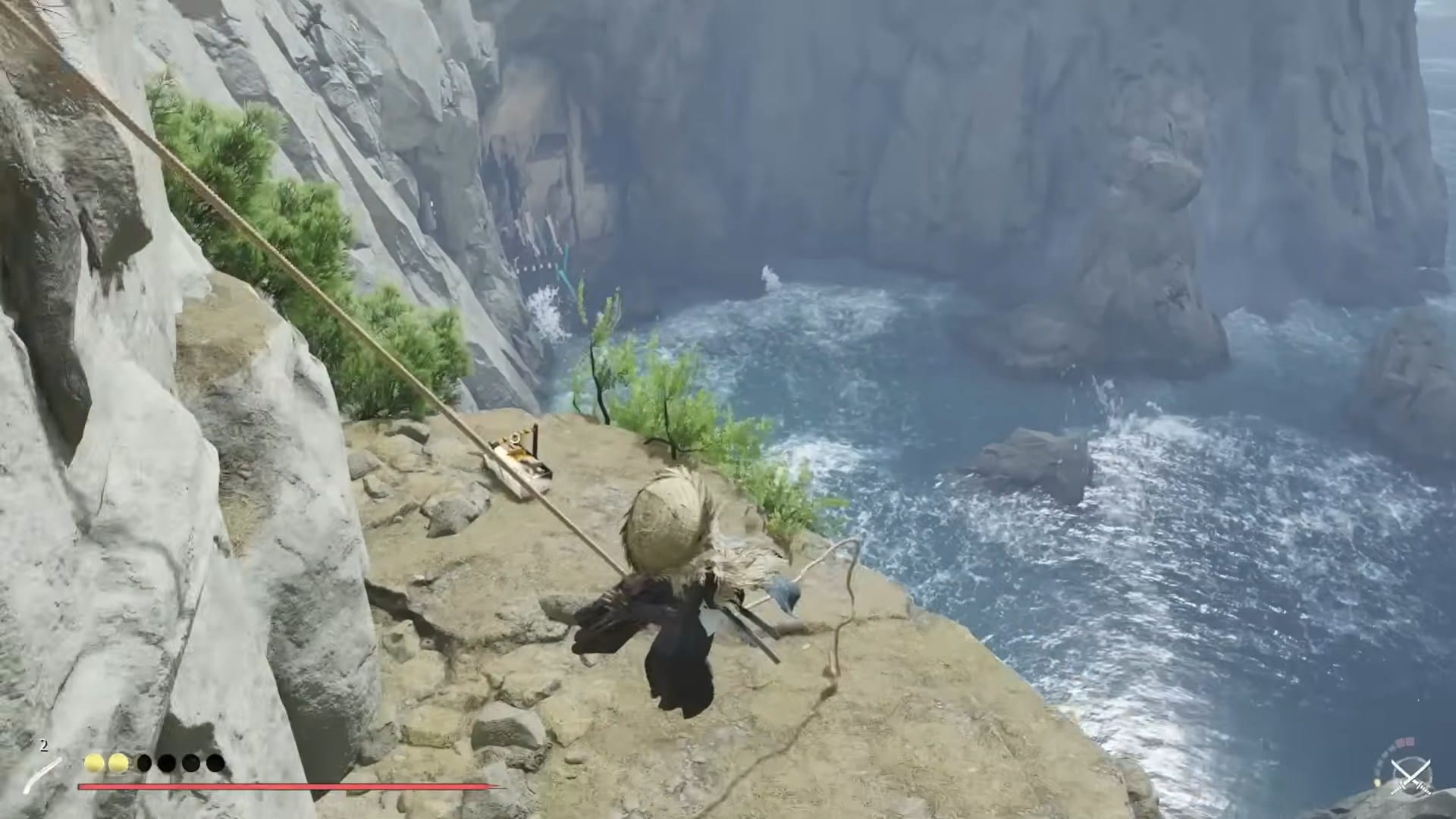 Look for a tree stump or grapple point on a cliff edge. Use your grappling hook to descend.