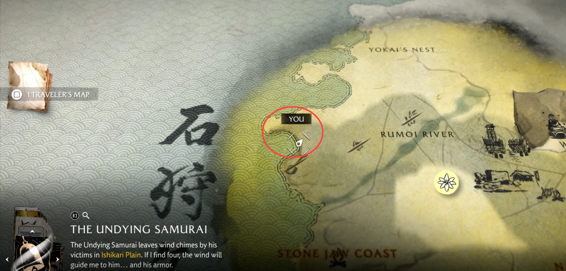 | Third Chime | South of Rumoi River, near the letter “m” on the map marker. | Rōnin Swordsman | A formal duel encounter — precision parries and counterattacks are key to victory. |