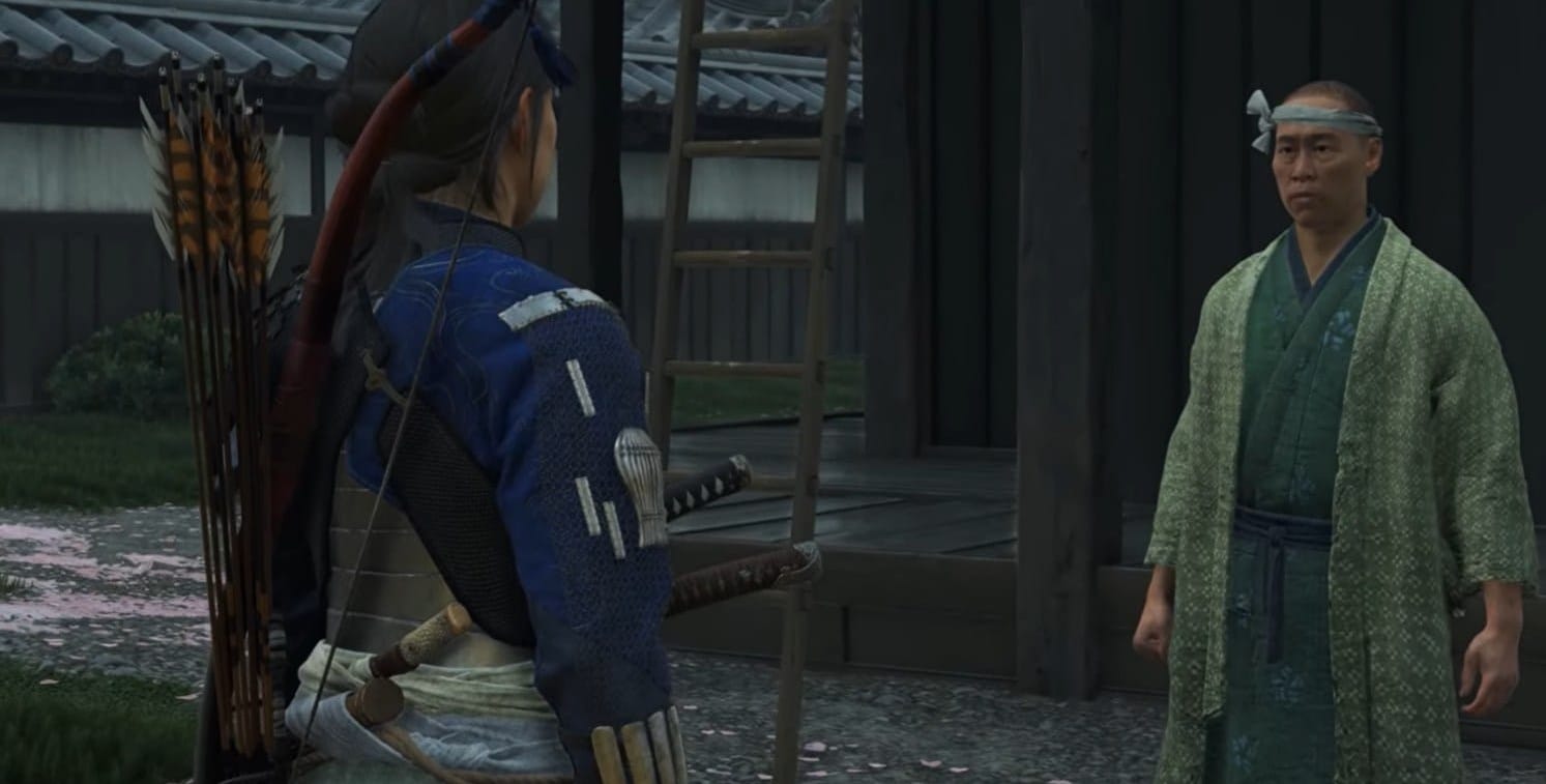 After clearing the camp, fast travel back (or return on foot) to Lord Kato’s estate. Talk to the NPC in blue robes positioned near the front gate. Then enter the building behind them.