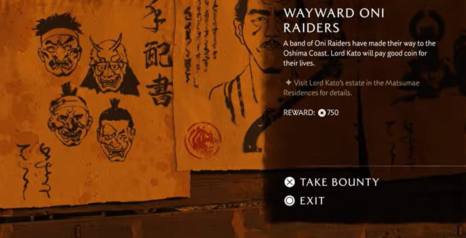- Head to the Bounty Board in Matsumae Residences (Oshima Coast) to pick up Wayward Oni Raiders.