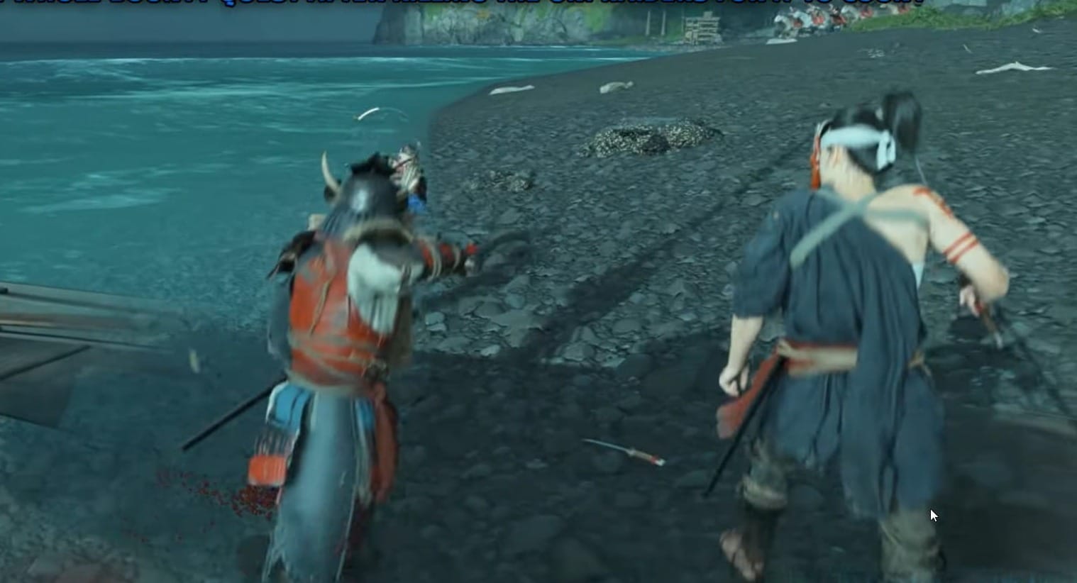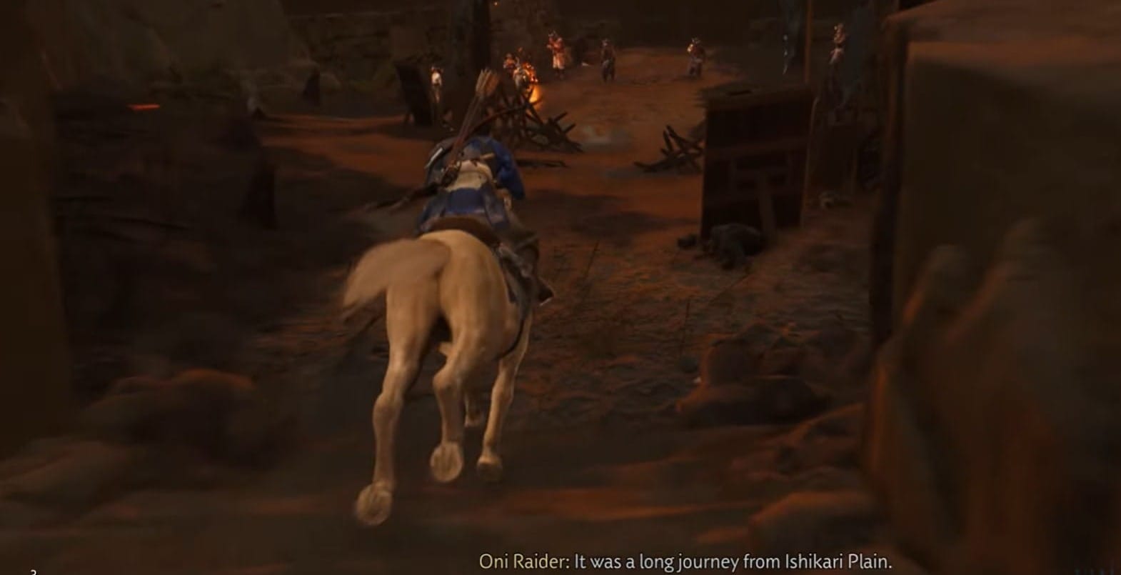 Mount your horse and follow Shiro as he leads you to a beach where more Oni Raiders await.