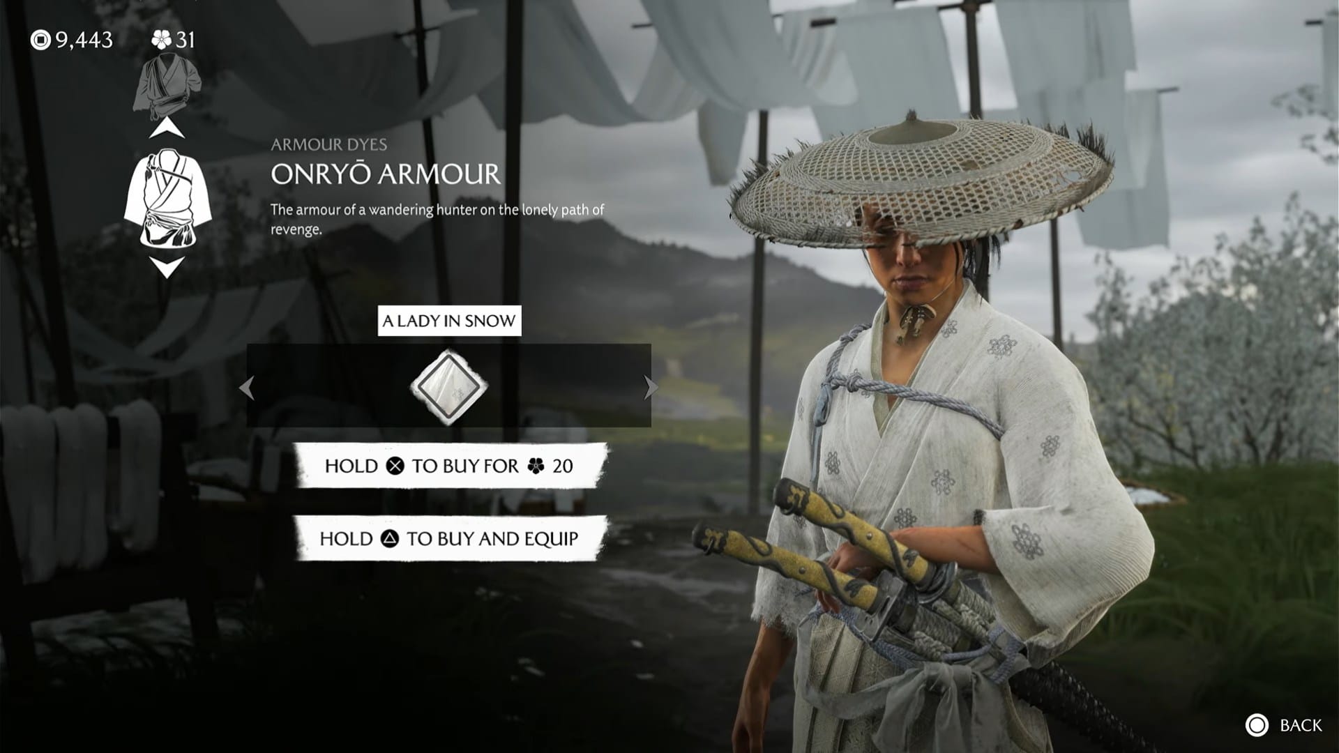 | A Lady in Snow | Armor dye (Onryo Armor) | 20 | A refined white dye symbolizing the elegance of a ghostly warrior. |