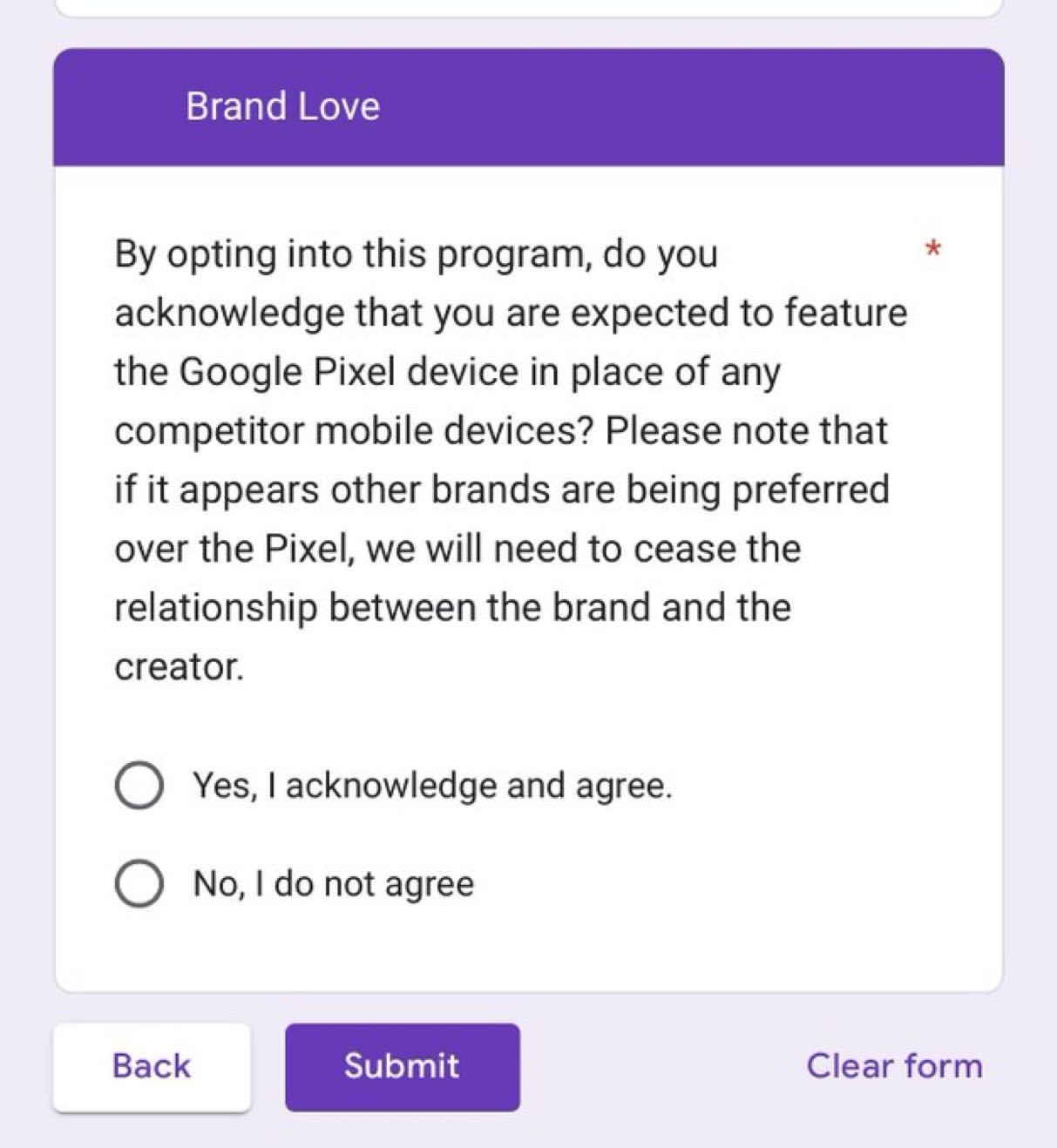 The leaked Team Pixel form reportedly included language that left little room for interpretation. Influencers were told they are “expected to feature the Google Pixel device in place of any competitor mobile devices“. The form went on to read “if it appears other brands are being preferred over the Pixel, we will need to cease the relationship between the brand and the creator.”