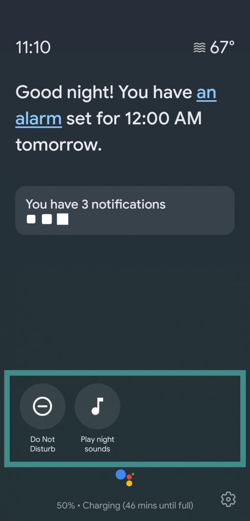The Ambient mode also allows you to execute a few actions without needing to unlock your phone through shortcuts. These shortcuts will only be visible as your approach night time. You will be able to enable or disable ‘Do not Disturb’ mode on your device, set an alarm, capture video through the phone’s camera or play Night sounds.