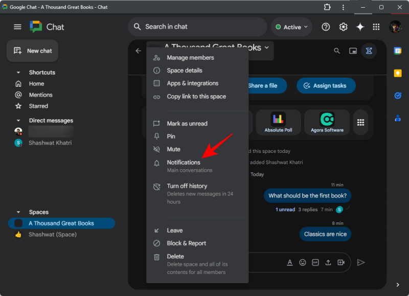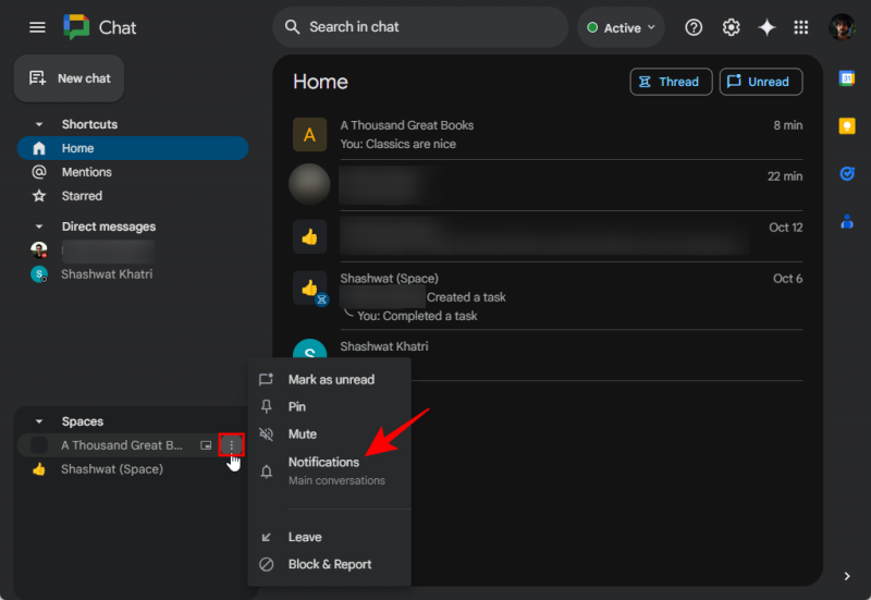 Alternatively, click on the three-dot icon next to the space and select Notifications.