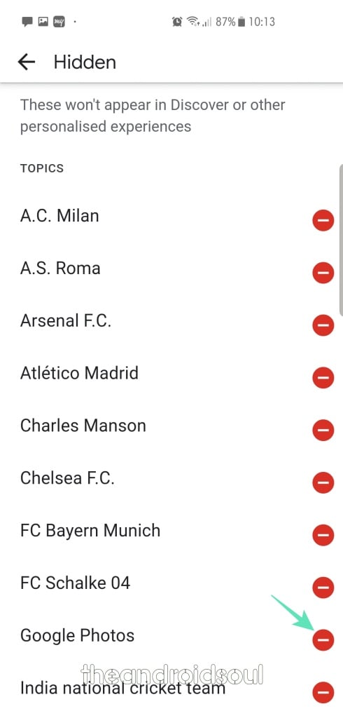 Step 4: Tap on the red hide icon adjacent to a topic to unhide it.