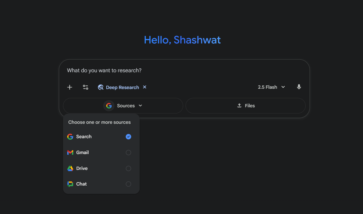 You can access this feature through the "Deep Research" option in Gemini’s Tools menu on desktop. After selecting it, choose which sources Deep Research can pull data from: