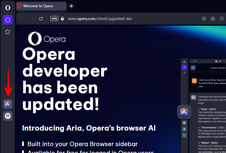 - Next, click on Opera’s default AI ‘Aria’ in the side panel on the left.