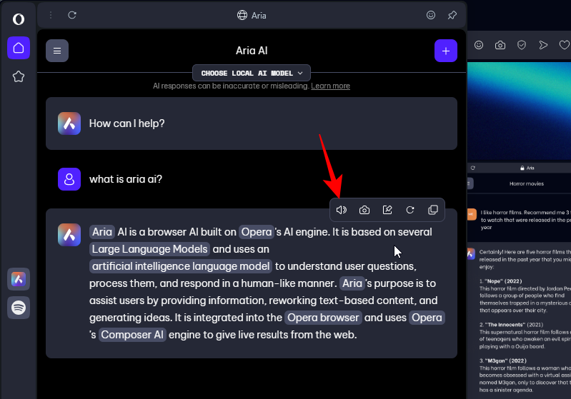 - You can only use this text-to-speech feature from Aria AI in the side panel. If you “Ask Aria” or use the