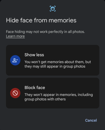 - Select Hide face from memories. When prompted, select Show less.