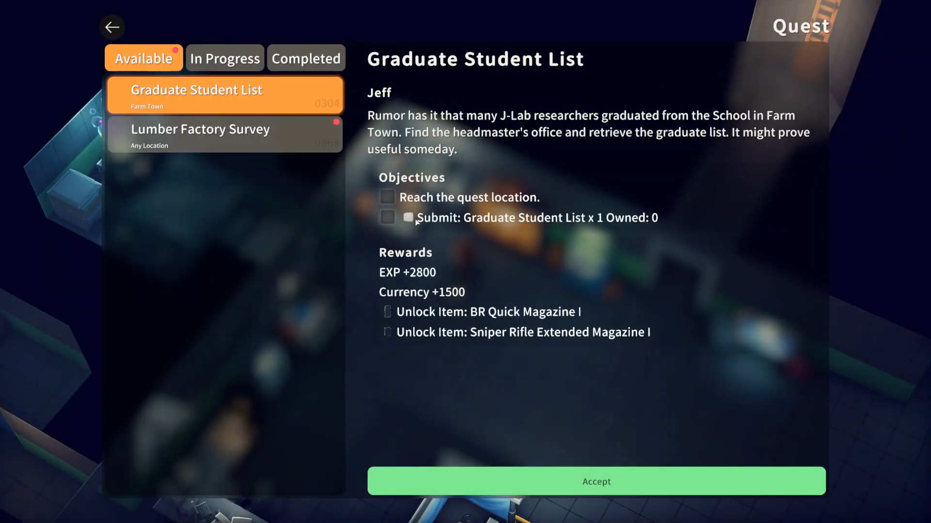 Jeff in Farm Town offers the Graduate Student List quest. You’ll investigate J-Lab’s school records to find the graduate list. Completing it grants XP, currency, and weapon magazine unlocks.