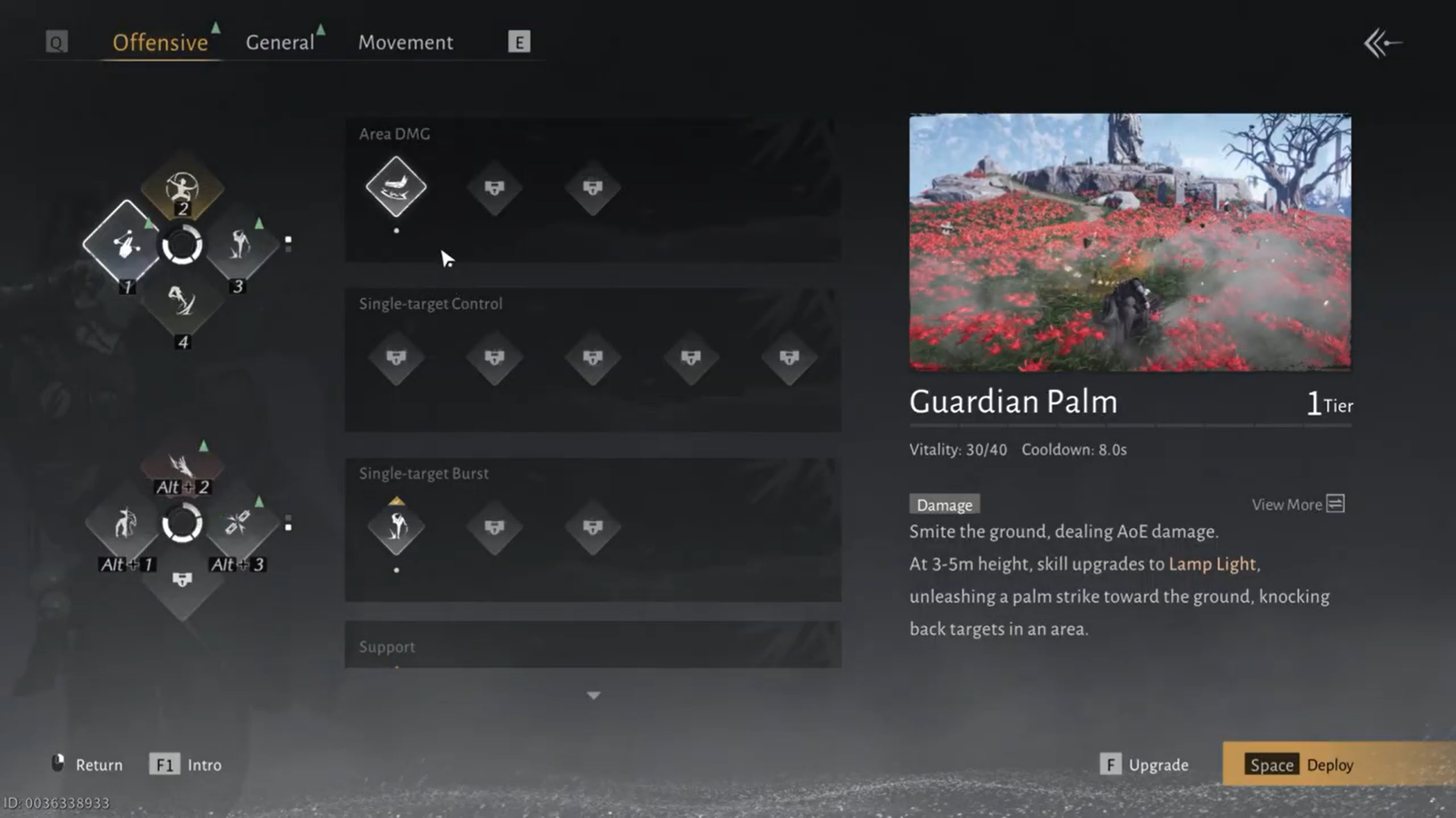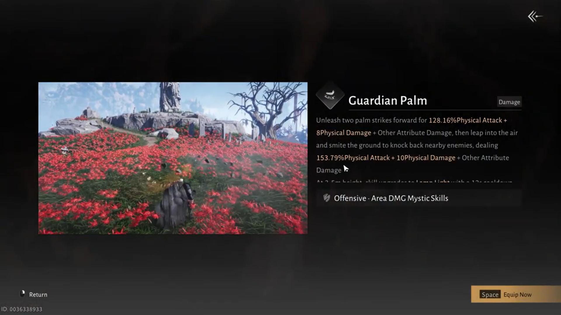 Guardian Palm is an Offensive → Area DMG mystic skill that delivers palm strikes followed by a ground-smite. When used from mid-air (3–5m height), the skill upgrades to Lamp Light, significantly increasing damage and applying a wide knockback effect.
