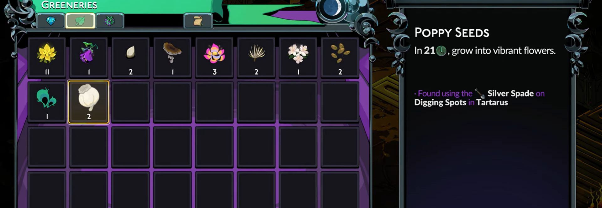 - You acquire Poppy Seeds via digging spots in Tartarus using the Silver Spade