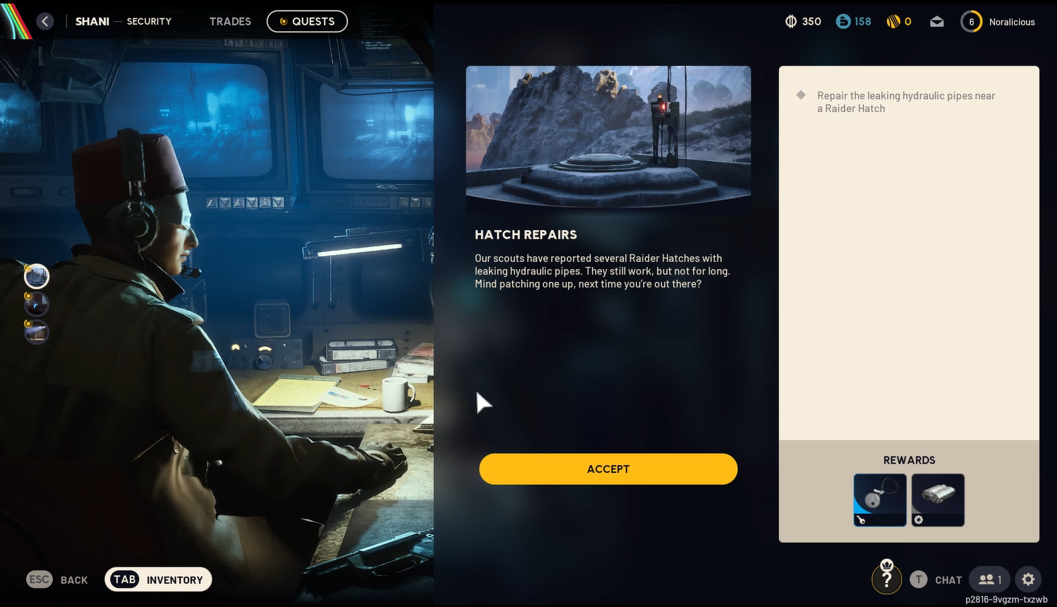 “Our scouts have reported several Raider Hatches with leaking hydraulic pipes. They still work, but not for long. Mind patching one up, next time you’re out there?” – Shani
