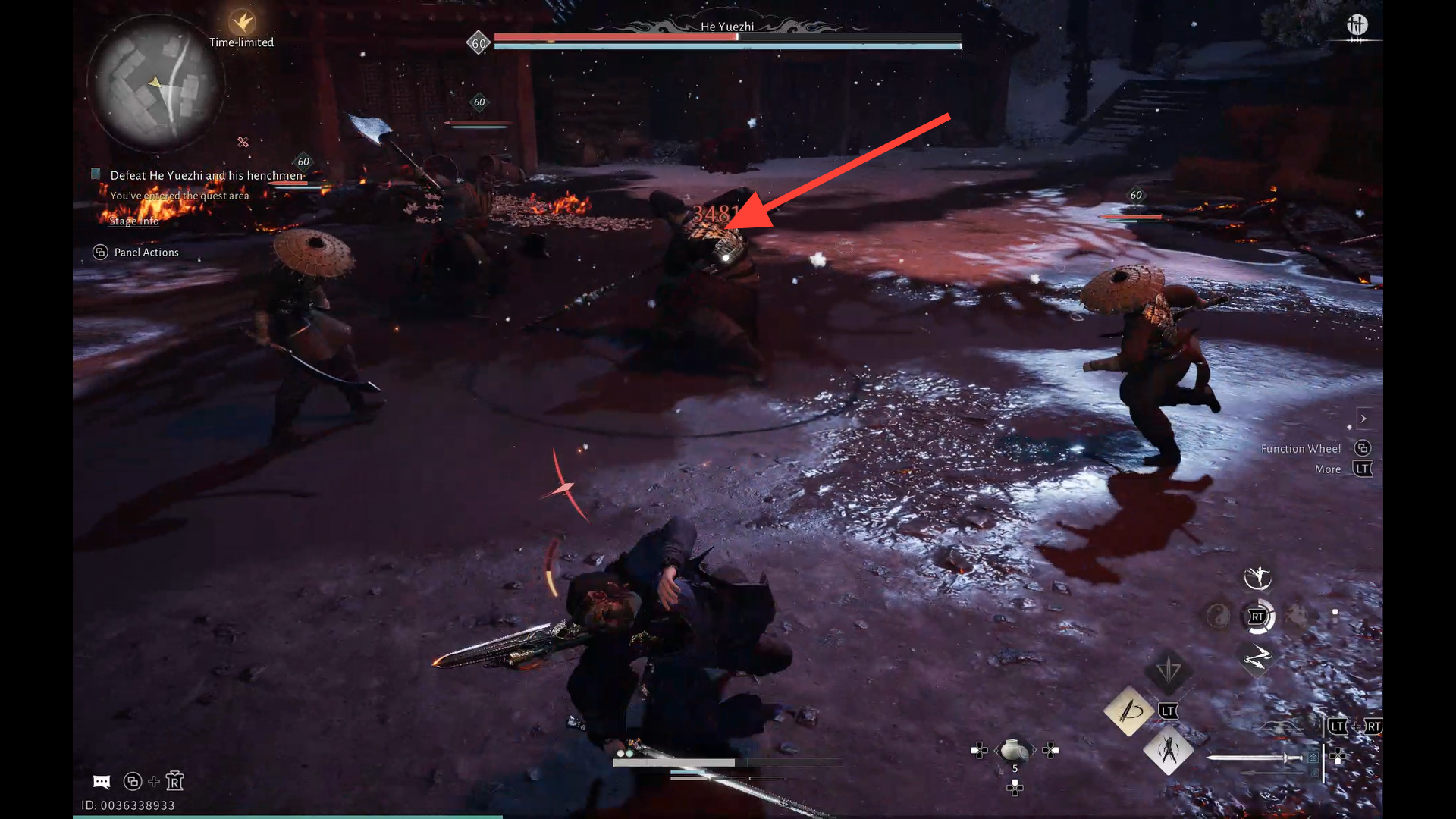 You approach the arena with henchmen around He Yuezhi. Clearing 1–2 closest ones reduces interruption and lets you focus entirely on him.