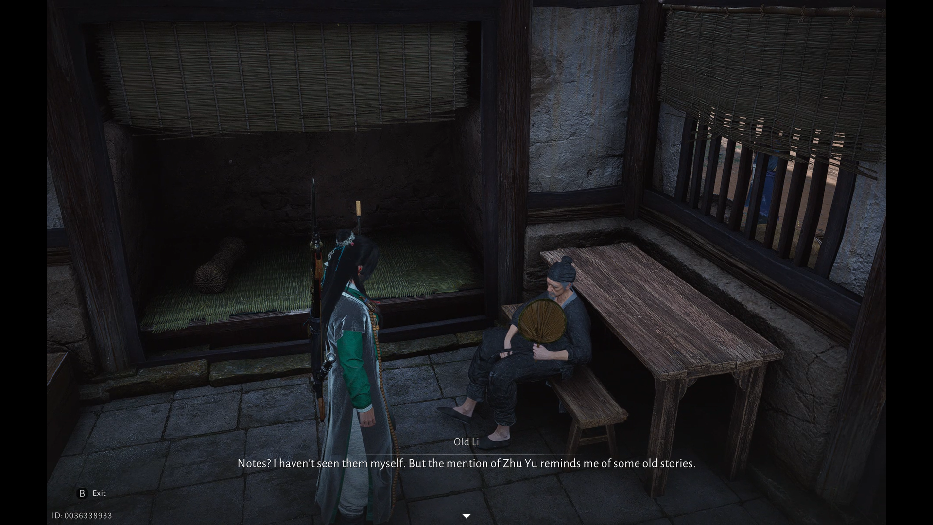 Go to Old Xing in search of Zhu Yu's notes. He lives on the east side of the village. He tells you to look for the notes at the Riversong Theater.