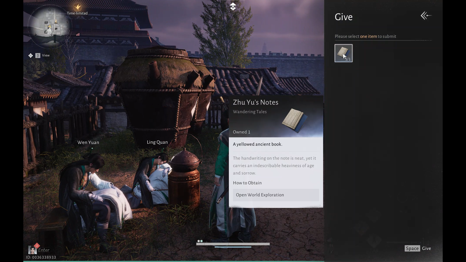 Travel to Verdant Hill Village in Kaifeng Suburbs North area and find Ling Quan. Talk to him about his brother and his illness. He asks you to get the doctor Zhu Yu's notes.