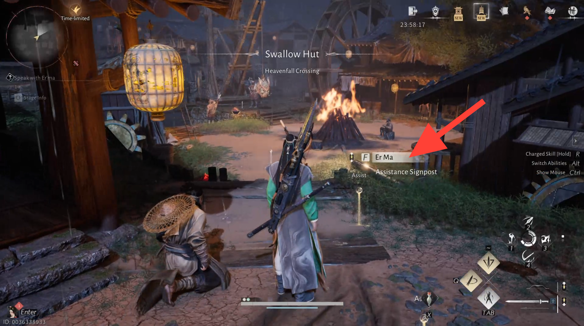 Follow Er Ma through Heavenfall Crossing until you arrive at Swallow Hut, then speak with him.