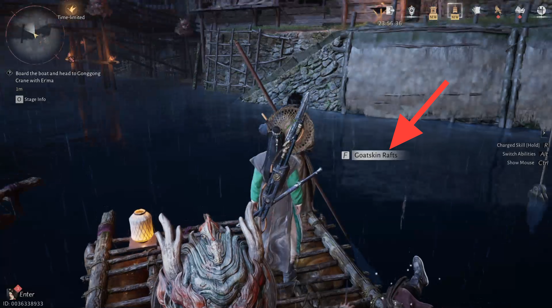 After placing the bait, board the raft with Er Ma and interact with the "Goatskins Raft" to move forward.
