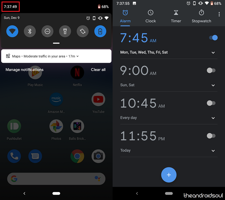 From any screen on your Android device, you can head over to the Clock app directly from the pull-down window. All you need to do is swipe down on the screen and tap on the Time in the top-left corner of the screen. This will immediately redirect you to the Clock app on your Android Pie device.
