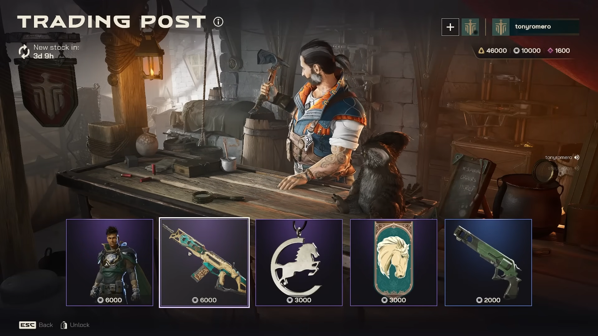 A daily trading camp refreshes with available items. Earn the required currency through gameplay objectives to purchase cosmetics and cosmetic upgrades.