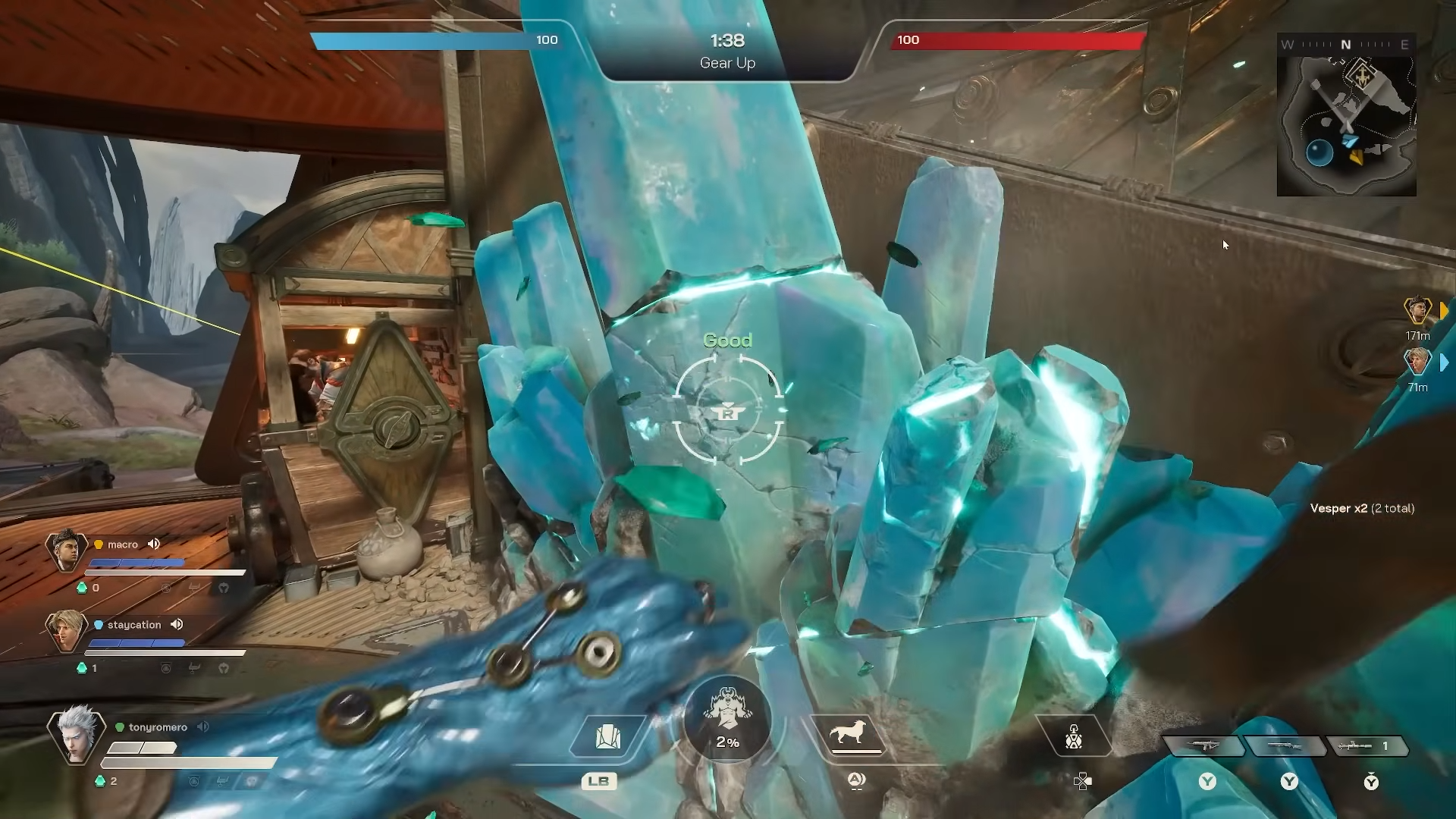 Passive – Supercharged Axe: Your charged axe releases electrical explosions that damage nearby resource nodes, accelerating Vesper collection.