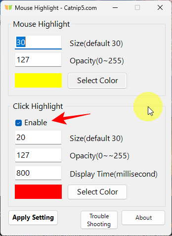 3. Under ‘Click Highlight’, make sure to there is a check next to ‘Enable’.