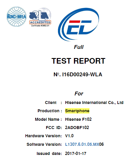 Chinese smartphone manufacturer Hisense Communication is working on a new device, images and specs of which has been leaked via certification site FCC. The model number of the device listed on FCC is Hisense F102.