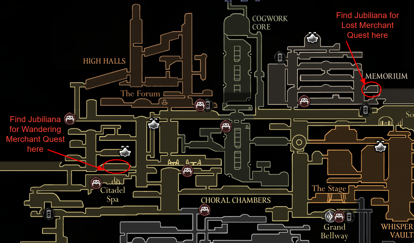 | The Lost Merchant | Find Jubilana in Memorium, protect her from enemies, and escort her back to Songclave. | Her shop expands, adding items such as the “Spider Strings” tool. |