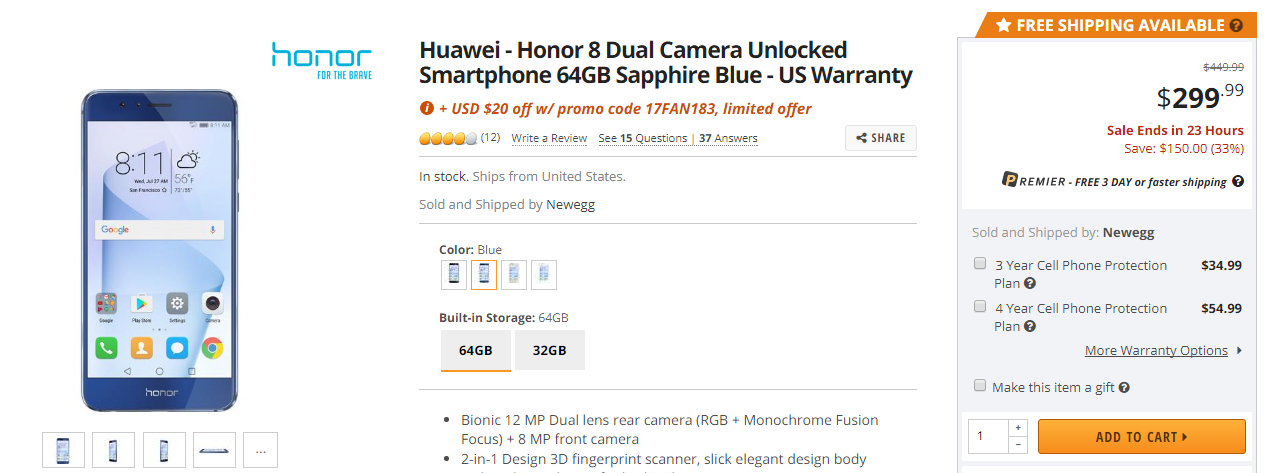 A killer deal on Huawei Honor 8 is underway at Newegg. The e-commerce site is selling the mid-range Huawei phone at a 30 percent or $150 discount. This brings the cost of Honor 8 down to $300 from $450. This price, further, gets slashed by another $20 to $280 on the application of the Promo Code 17FAN183.