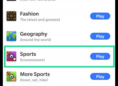How to start the Trivia Sports game: Hit the Dice button near the top-right corner, and tap Trivia. On the next screen, scroll down and tap Sports. (Another good option is More sports.)