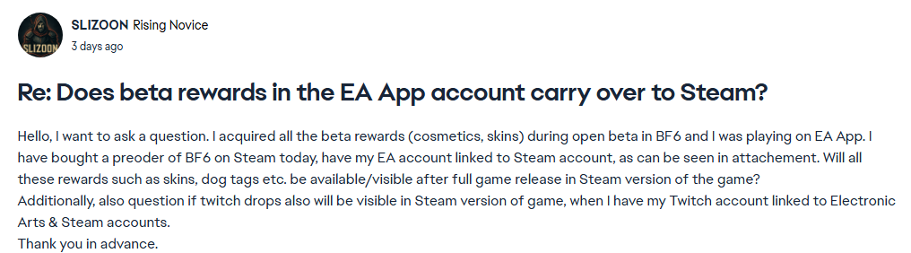 The issue was first reported by a user on EA's forum who moved their purchase from the EA App to Steam. Their central concern was the fact that their cosmetic items, skins, and dog tags earned during the beta were not visible in the Steam version.