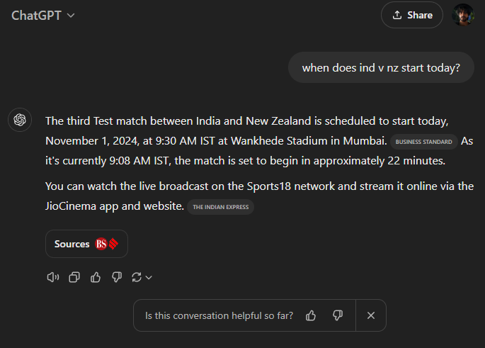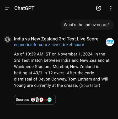 And being primarily a chatbot does significantly limit how the information is delivered (at least for now). Google on the other hand lets you search based on different modes and categories, provides real-time and animated updates for sports, stocks, weather, etc. and helps you find related content based on what other users are searching for.
