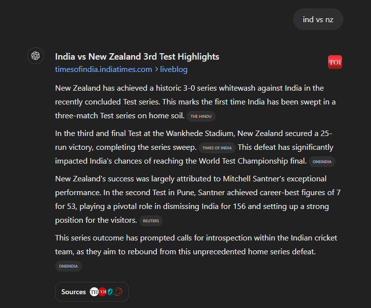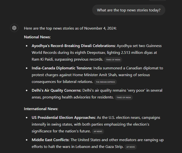 - ChatGPT Search provides contextually aware, real-time updates and search results, along with sources and citations.