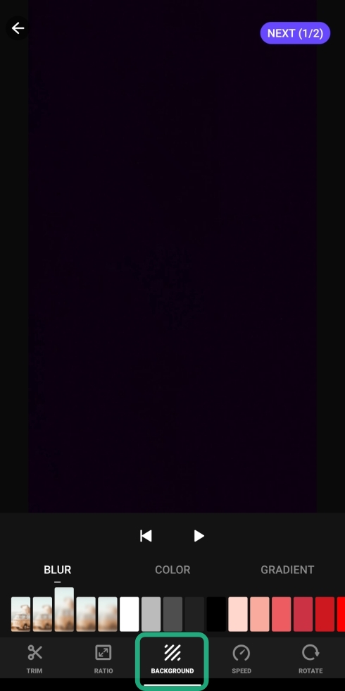 - Color: If you wish to set a background for a recorded video but do not want it to have blurred spaces around it, you can choose from various preset colors as a background for the edited video. You can set one colored background from around 50 colors available for choosing.