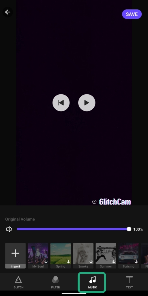 - Music: Besides the glitch effect, you can add songs to your video selecting from the options down below.