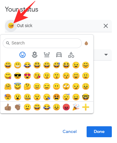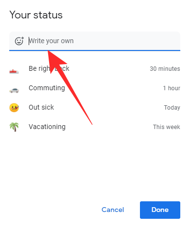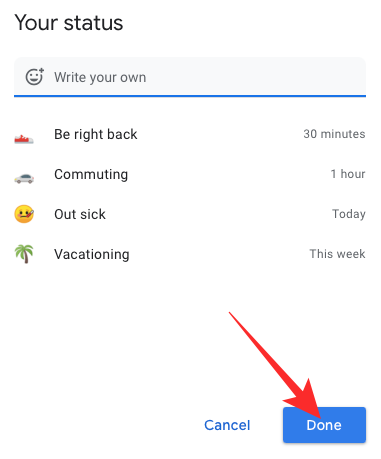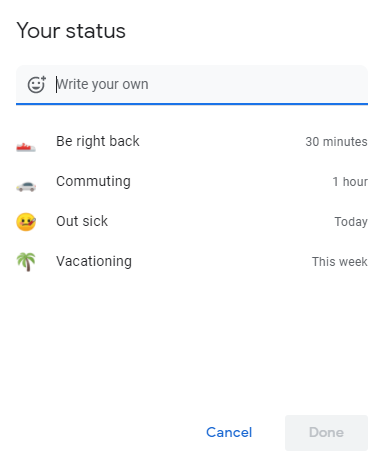 When you select any of the default messages, Google will simply load its text and time for you in a pop-up. You can edit the text, the emoji, and the timer, before clicking done and setting it as your status.