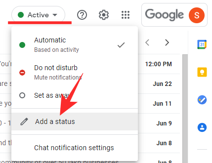 Go to mail.google.com or chat.google.com and log in with your Google Workspace account. At the top-right portion of the screen, you will find the status message at the top of your screen — shown as ‘Active’ and set to ‘Automatic.’ Click on it and you’ll find the presets — ‘Do not disturb’ and ‘Set as away’ — alongside an ‘Add a status’ option.
