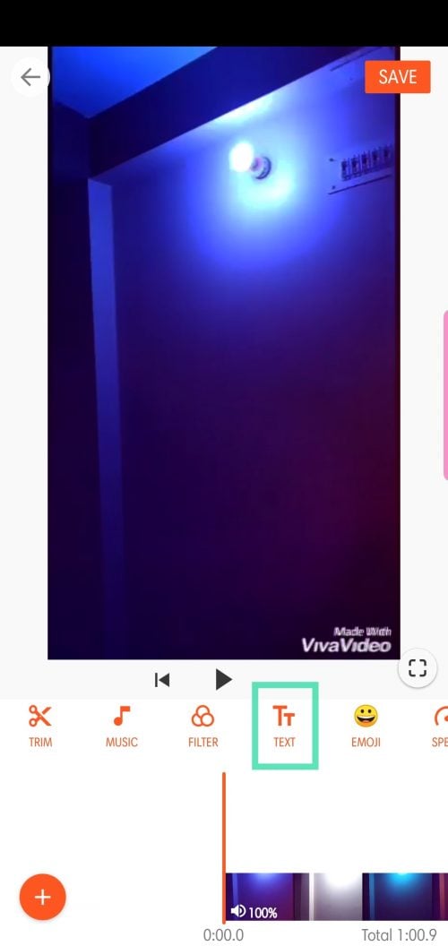 Inside the editing screen, use the video navigation panel to fast forward the video and select the frame where you wish to add text. Once you’ve found the place to add a text, tap on the ‘Text’ tile from the toolbar at the bottom. The keyboard will appear on your screen and you can type whatever you wish to add to the video here.