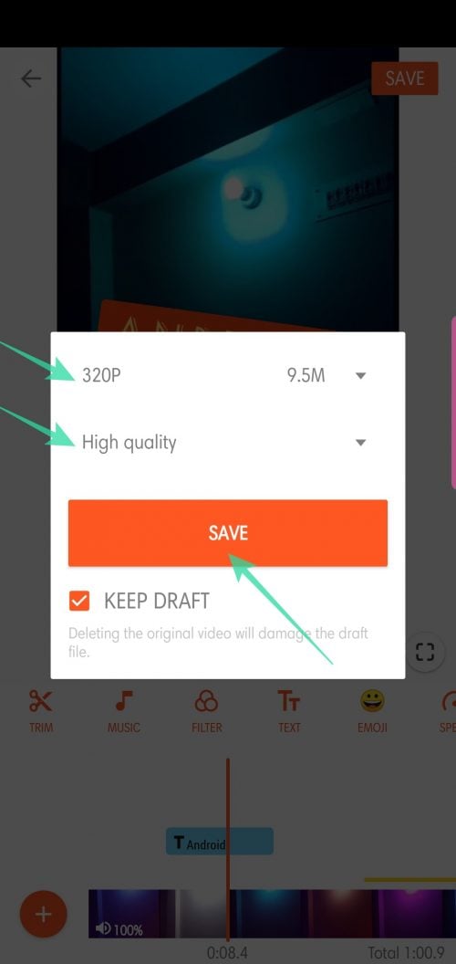 When you go back to the main screen, you can adjust the sliders to change the text’s screen time and denote the starting point and ending point. After that’s done, tap on ‘Save’, select the resolution of the video you want to save and tap on Save. After you’ve saved the video, you can share it directly on social media apps from Youcut.