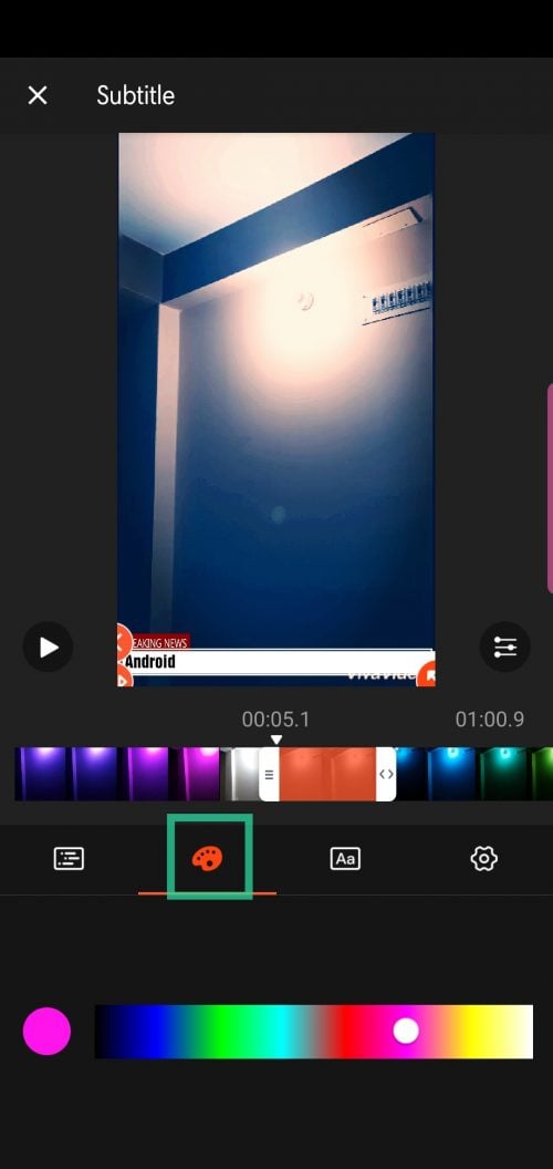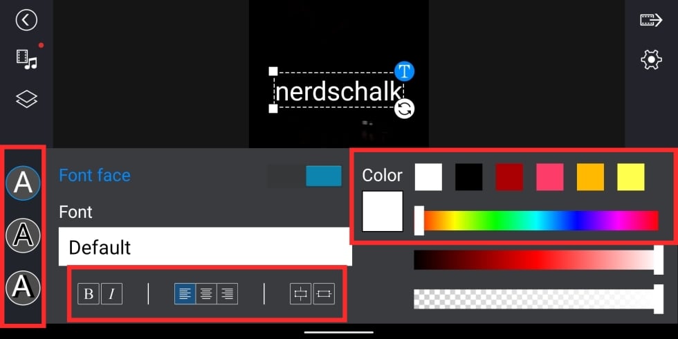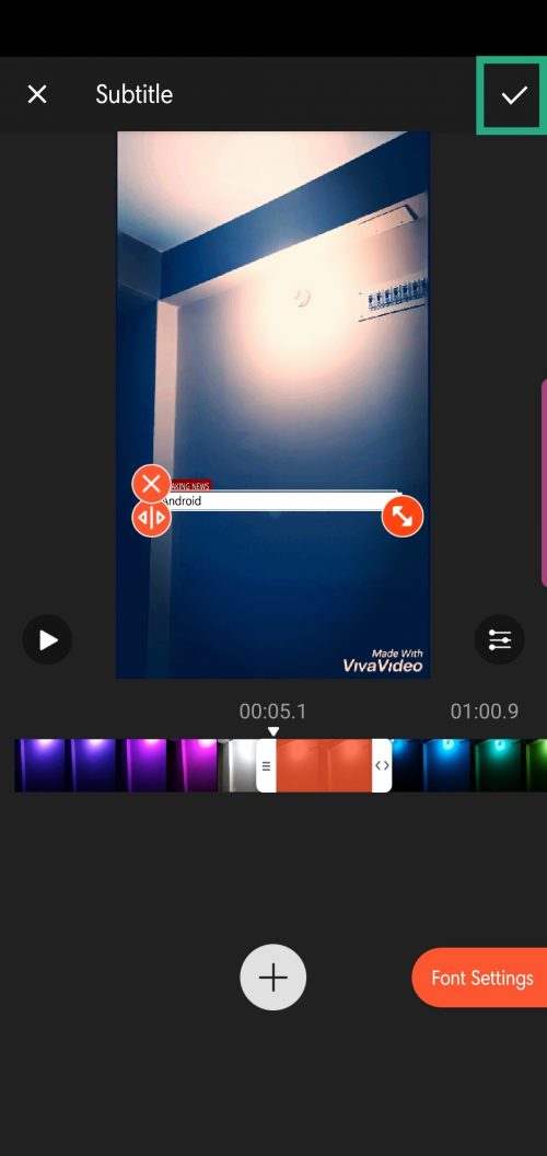 YouCut also lets you change the color of the text, label, border, shadow, and at the same time adjust its opacity, all of which can be done by tapping the circular rainbow icon. You can make other adjustments to the text like alignment, character spacing, and line-height by tapping the ‘Settings’ icon. After you have completed all the necessary changes, tap on the tick mark icon.