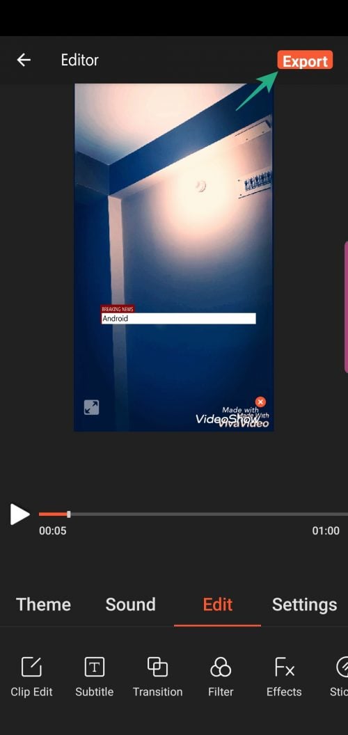 Once all the adjustments have been done, tap on the tick mark button on the top right corner and hit the ‘Export’ button to save the video. After that, tap on the ‘Save to Gallery’ button to complete the save process.