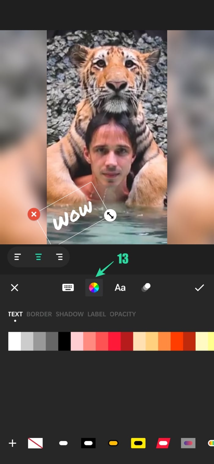 After typing the text, you can make other necessary changes to it like changing its position, resizing, and more. The app lets you change the color of the text which you can do by tapping on the Colours icon, choosing a color, and add other details to this text. You have the ability to add borders, shadows, labels, change fonts, and adjust the opacity of the text inside the video.