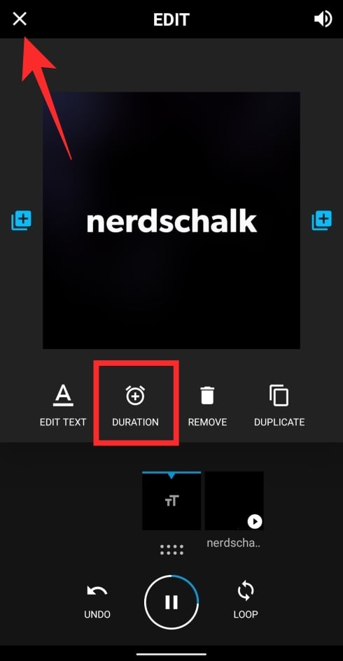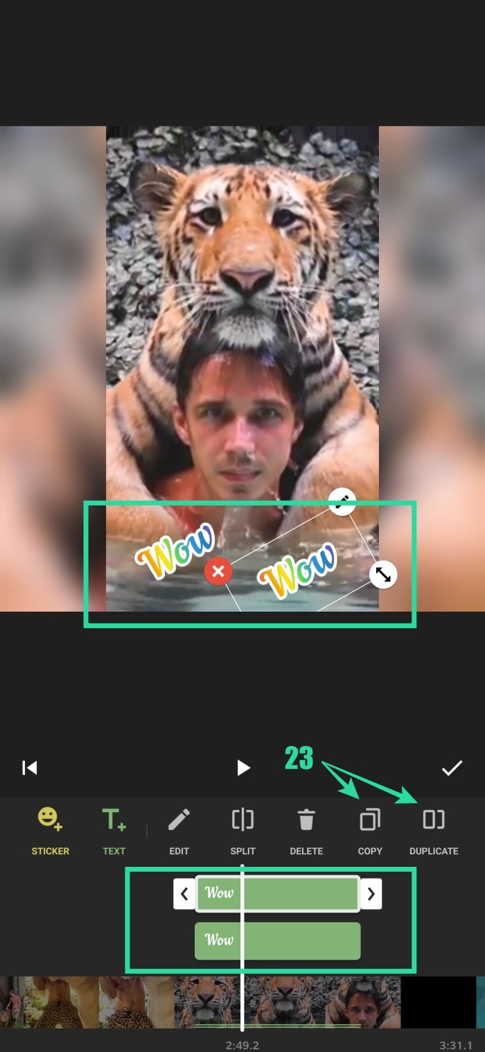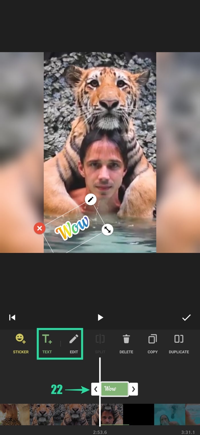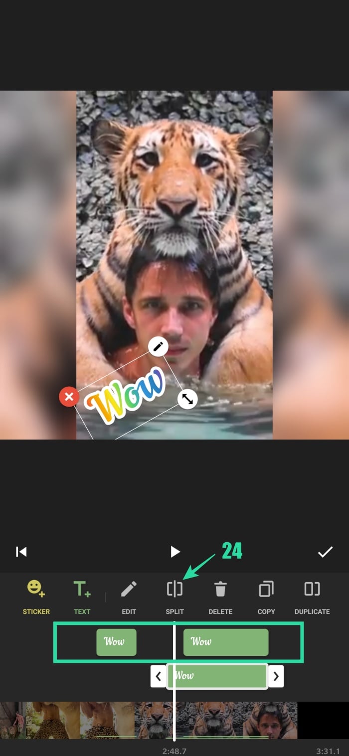 Use the slider to the left and right of the text near the video navigation panel at the bottom to change the duration of the text displayed in the video. You can also Copy or Duplicate the text to display it multiple times in the video. Use Split if you wish to have a portion of the video without any text effects. Tap on the Delete icon to remove the text.
